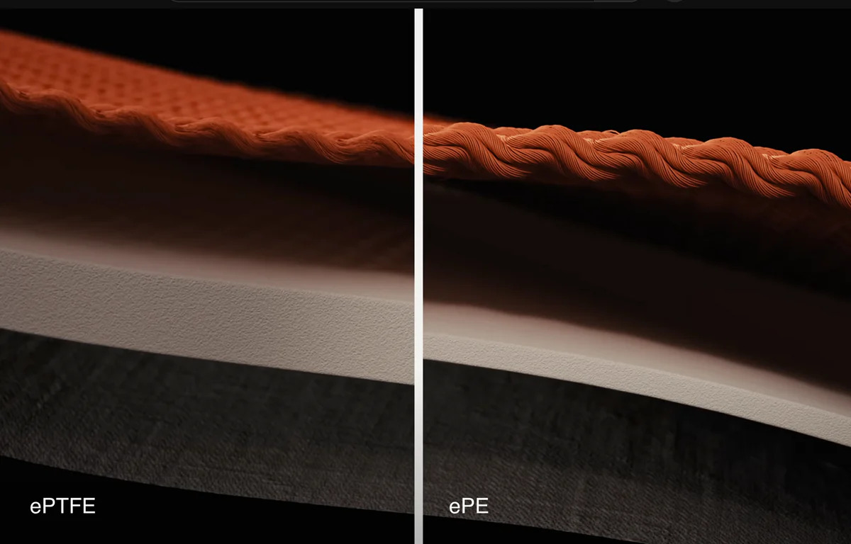 従来のePTFEメンブレン(左)と新たに採用されたePEメンブレン(右)の厚さの比較