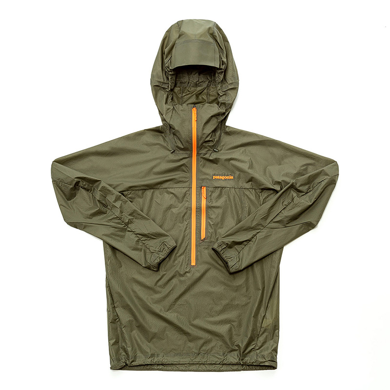 耐風・撥水の生地を使用するプルオーバーは、ハーネスの下に収まりやすいスリム・フィットで、腕を頭上に伸ばしてもはみ出さないよう、裾は長めにデザインされている。フードはヘルメットの上からフィットするサイズ感。使用しないときは小さく収納でき、付属のリングで吊るすこともできる。