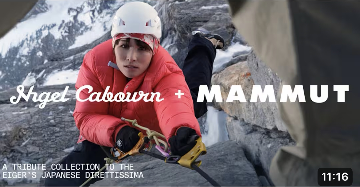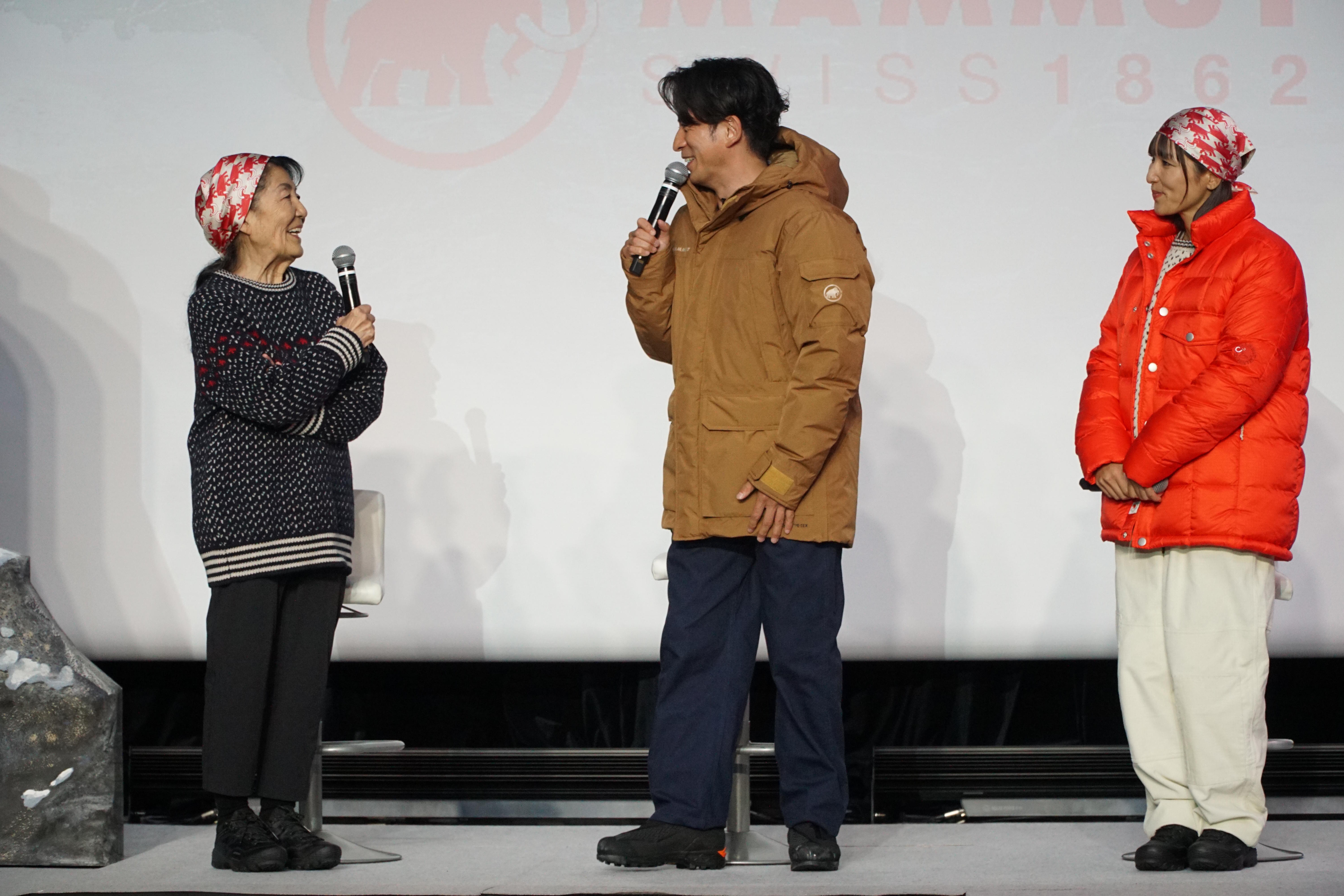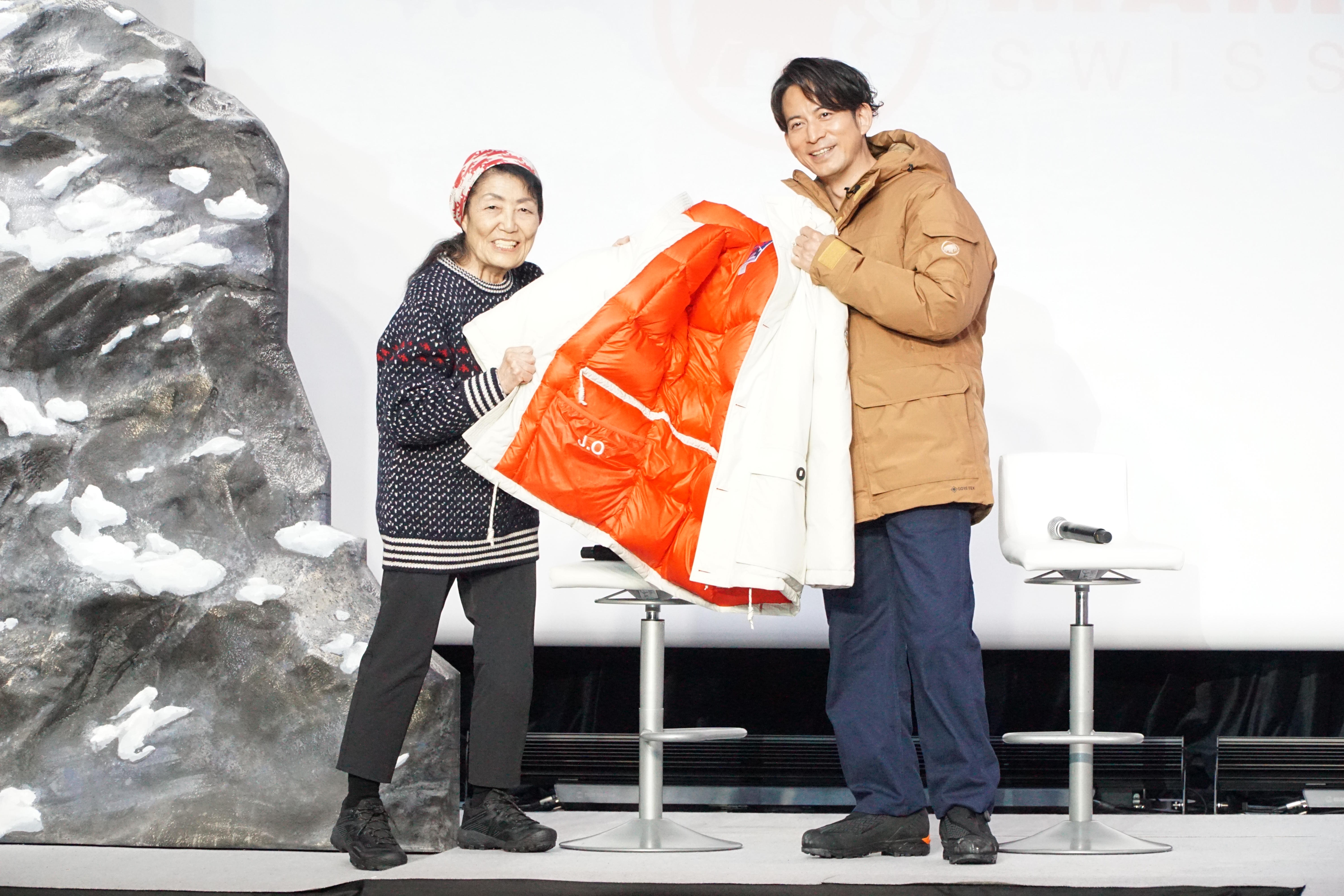 続いて紹介されたのは、1969年に日本隊がアイガー北壁を直登した「ジャパン・ディレティシマ」から着想を得たコラボレーションコレクション。英デザイナー、ナイジェル・ケーボンとの協業により実現した。登山家の今井通子とマムート・アスリートであるクライマーの小林由佳が登壇し、岡田を交えて当時の挑戦を振り返るトークを展開。今井は「歴史が新たに形を変えるのは感慨深い」と語った。岡田にはケーボンから特別映像とともに、ネーム入りの限定ジャケットが贈呈され、今井から手渡される場面もあった。