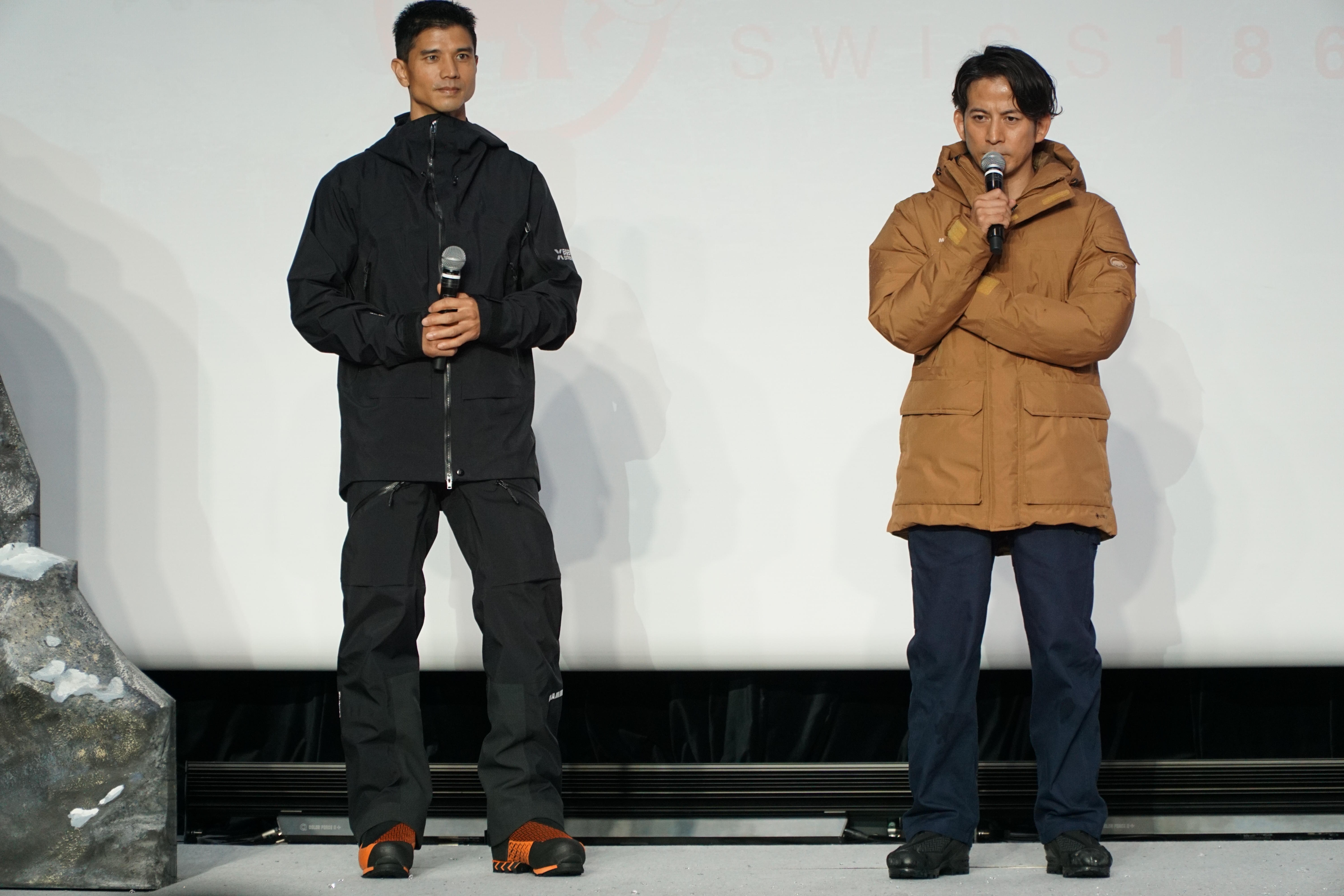 フィナーレでは岡田准一が「ドライ・ダウン コレクション」を着用し、本物の氷を使った高さ約4.5メートルのアイスクライミングに挑戦した。両手にアイスアックスを握り、アイゼンを蹴り込みながら慎重に高度を上げていく。見事氷柱のトップに達すると「厚みがあるのに軽く動きやすい」と着心地を称賛した。サポートしたマムート・アスリート青木達哉も「さすがの身体能力」と評価し、会場を盛り上げた。